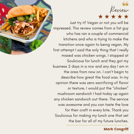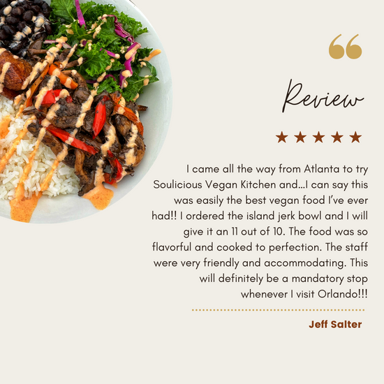Welcome to Soulicious Vegan Kitchen, where we offer a soulful experience redefining your favorite comfort foods with a plant-based twist. Located in the heart of Apopka, FL, we serve vegan soul food that satisfies cravings and nourishes the soul. From crispy vegan fried chicken to creamy mac and cheese, our dishes deliver nostalgia and flavor in every bite. Whether you're a seasoned vegan, exploring vegan food or transitioning to a plant-based lifestyle, you'll find something to love at our restaurant.