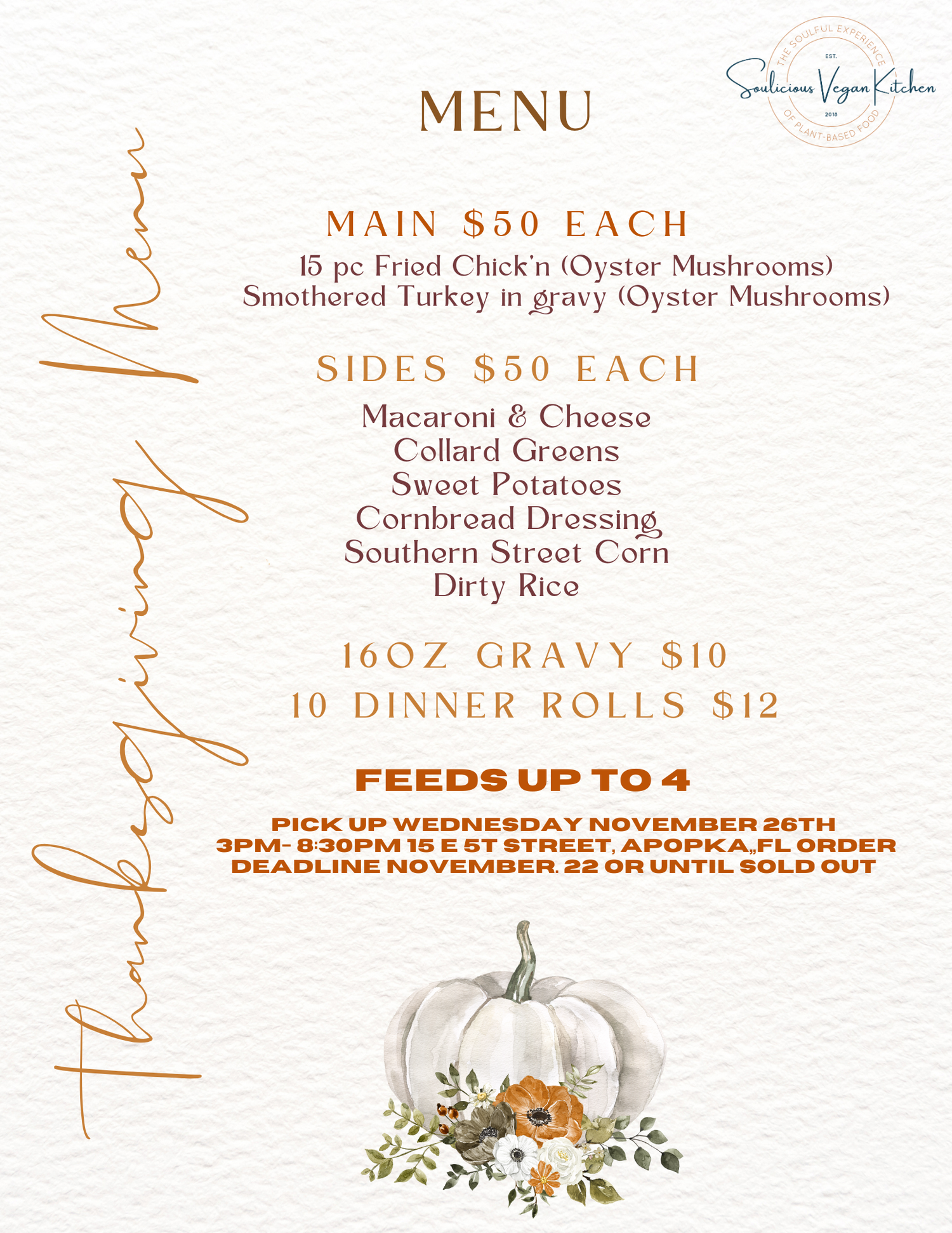 Bring the flavor home this holiday with our plant-based twist on Thanksgiving classics. Each dish is made from scratch with love, seasoned and soulful. Choose your favorites and let us handle the cooking.